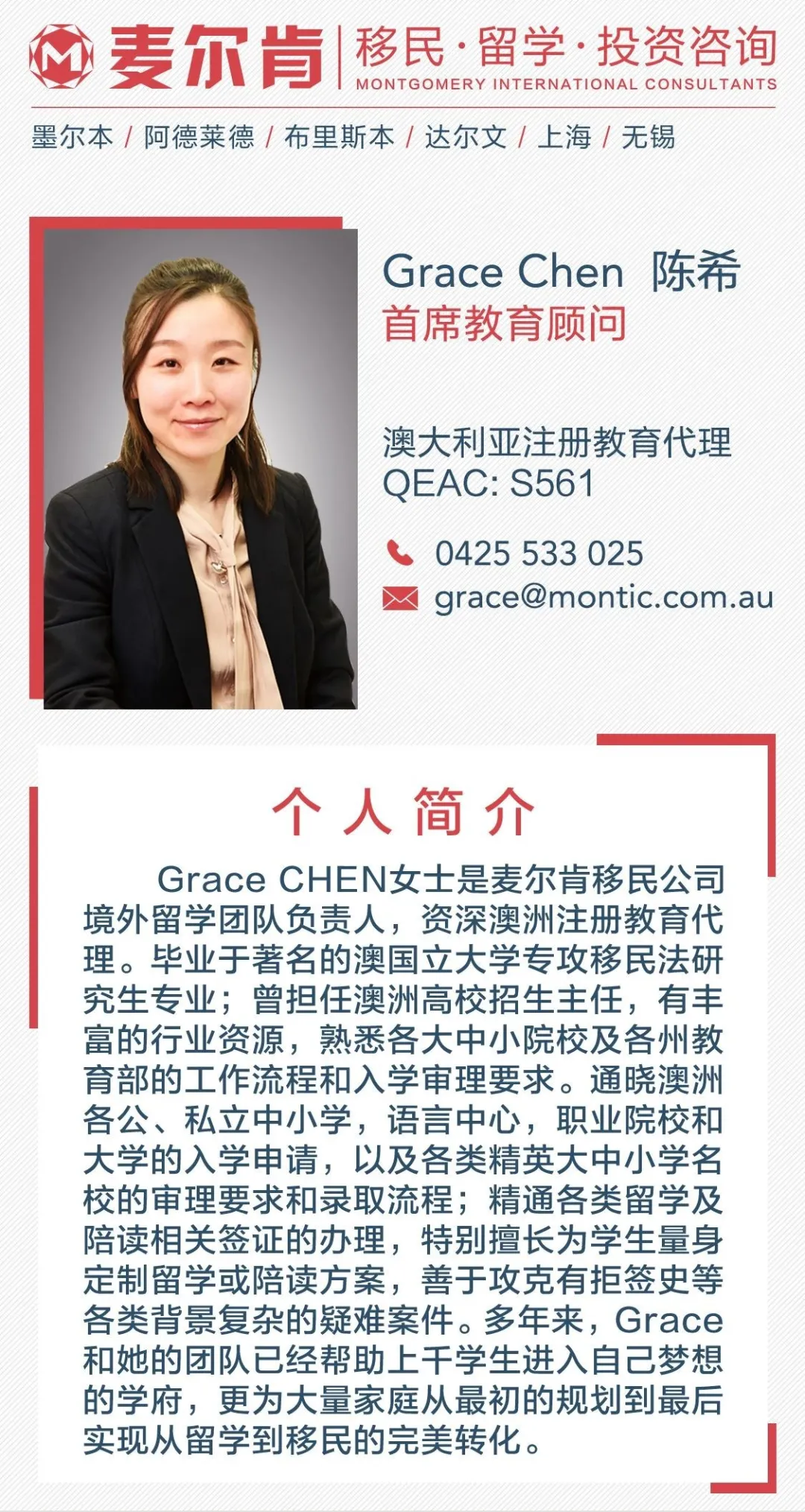 Grace CHEN留学签证专家:麦尔肯留学部负责人,资深澳洲注册教育代理,澳国立大学移民法硕士。曾任澳洲高校招生主任,精通澳洲各院校申请及签证办理,尤其擅长定制留学/陪读方案,成功帮助上千学生圆梦名校,并助力众多家庭实现留学到移民的完美转化。如需办理留学相关业务,请尽快联系我们,Grace老师将为您提供专业解决方案!