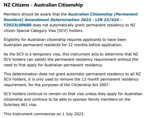 根据澳大利亚公民身份(永久居民)修正案2023 - LIN 23/024 - F2023L00680,澳大利亚将不再自动授予新西兰公民特殊类别签证 (SCV)持有人永久居留权。要想获得澳大利亚公民身份,新西兰的申请人必须在申请前12个月获得澳大利亚永久居民。 该法案于2023年7月1日生效。