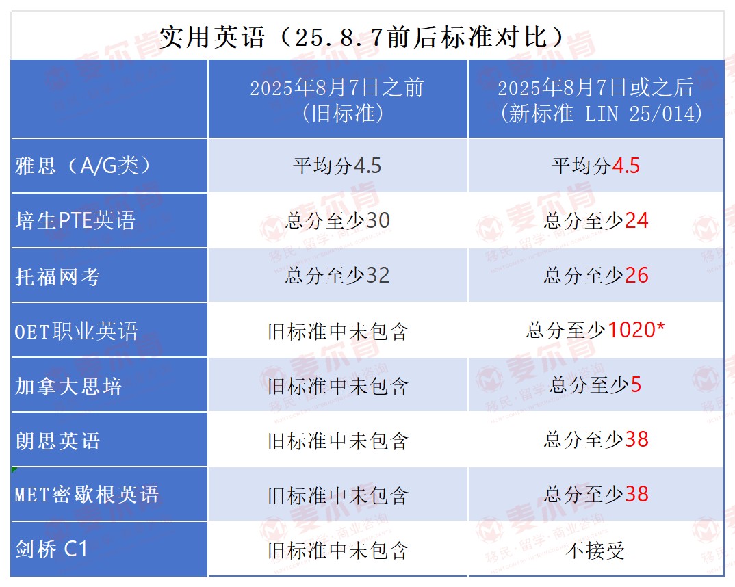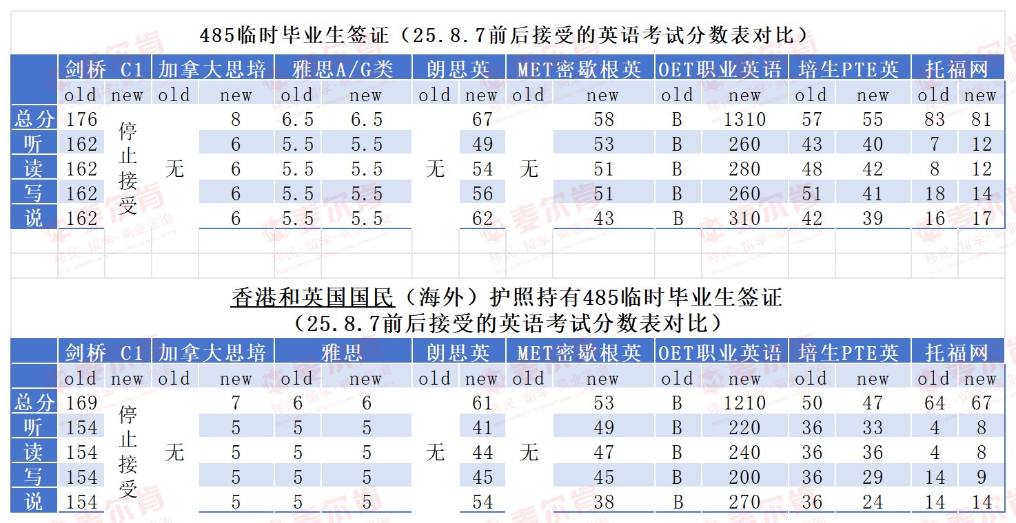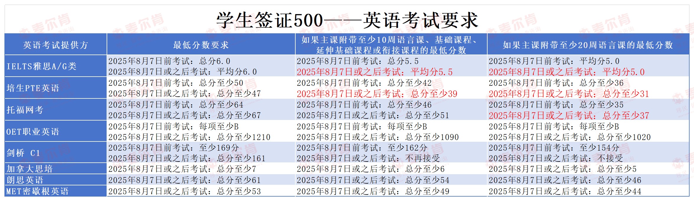 2025年8月7日之后,部分考试的要求略有降低(例如PTE从总分50降到47,TOEFL从64降到60)这对申请人更有利,门槛下降。