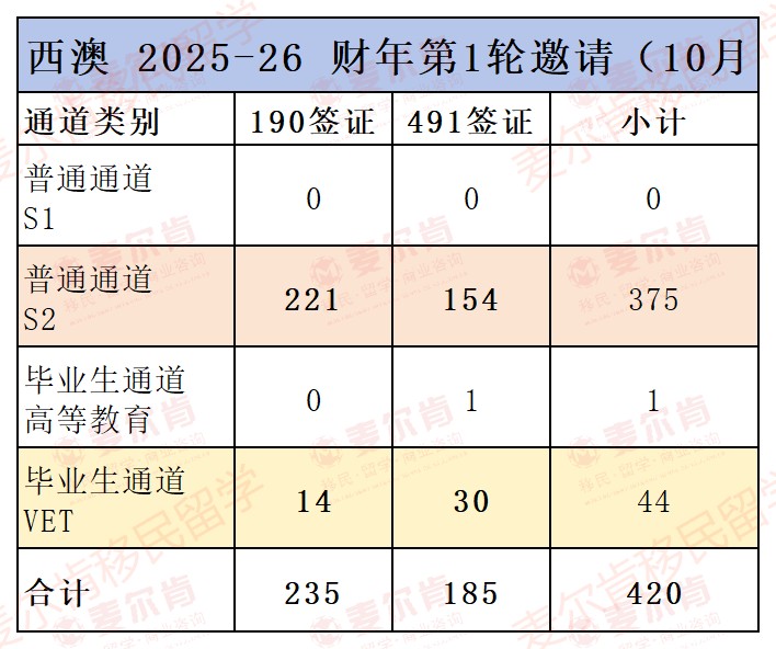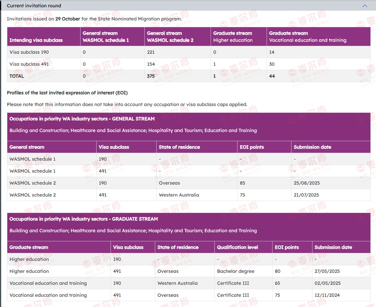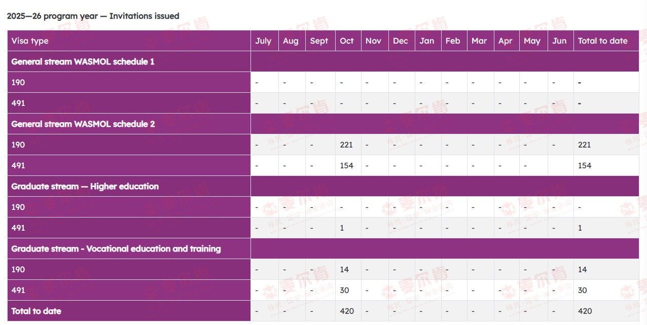 邀请时间:2025 年 10 月 29 日,Western Australia State Nomination Program(190 / 491)本轮共发出邀请 420 份,具体分布如下:
