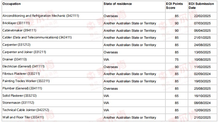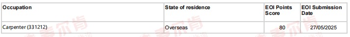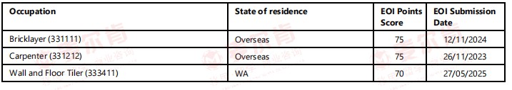 本轮EOI分数区间集中在 75–90 分之间,海外申请人依旧有不俗表现,说明西澳在劳动力短缺领域仍积极引入境外人才。