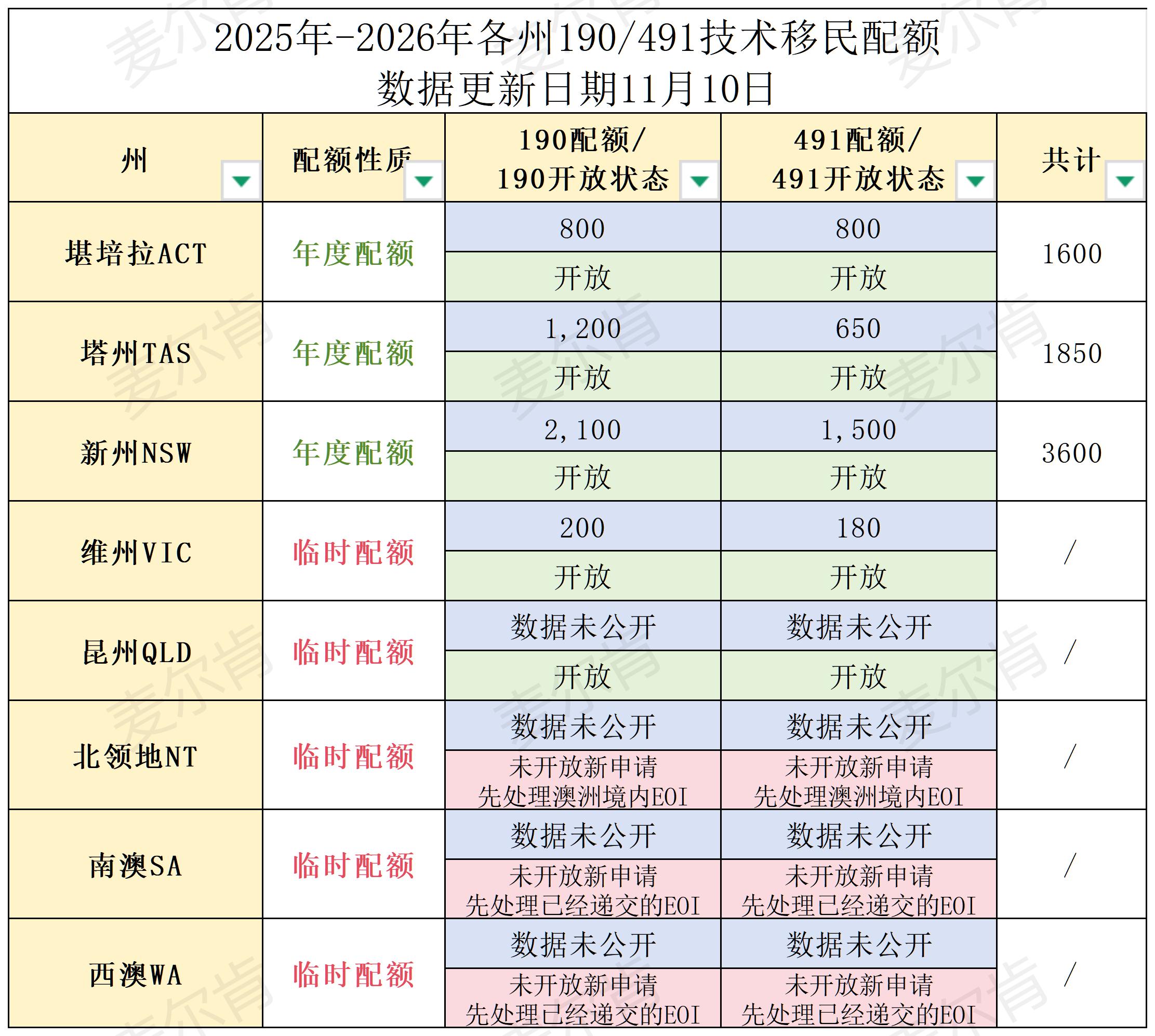 澳洲移民局更新了2025-2026财年各州190与491签证的最新配额情况。此次更新不仅揭示了部分州的正式年度配额,也让我们看到了临时配额的分布格局。