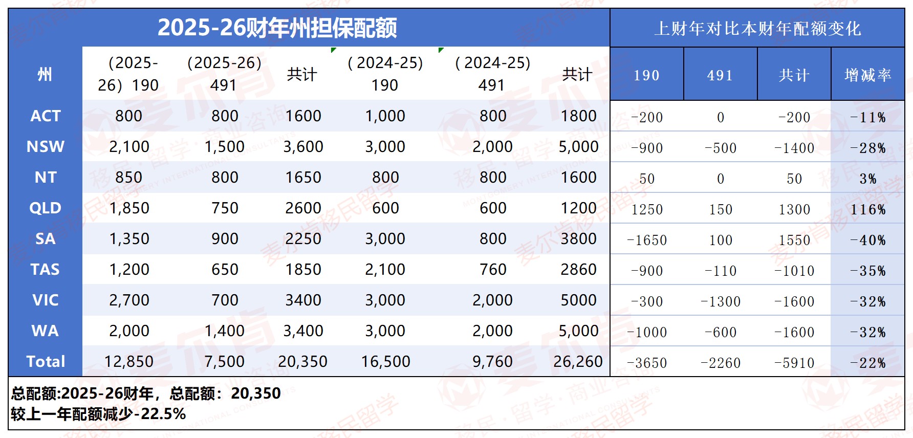移民局官网终于更新州担保完整配额!澳洲的技术移民配额每年都会有所调整,而2025-2026财年在配额分配上进行了多方面的变化。