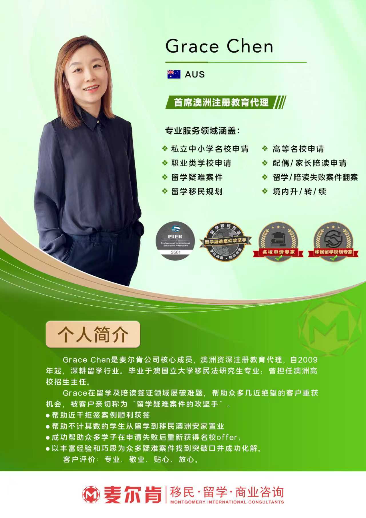 Grace CHEN留学签证专家:麦尔肯留学部负责人,资深澳洲注册教育代理,澳国立大学移民法硕士。曾任澳洲高校招生主任,精通澳洲各院校申请及签证办理,尤其擅长定制留学/陪读方案,成功帮助上千学生圆梦名校,并助力众多家庭实现留学到移民的完美转化。如需办理留学相关业务,请尽快联系我们,Grace老师将为您提供专业解决方案!