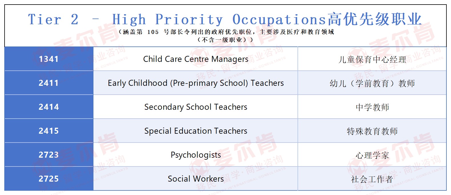 这些职业的配额上限将设定为该职业在澳洲现有从业人员总数的2%。这包括中小学教师、幼儿中心经理、儿童护理员、心理咨询师、社会工作者等。